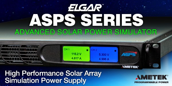 SAN DIEGO, CA (April 10, 2024)- 阿美特克程控电源事业部发布Elgar™品牌新一代航天器太阳能阵列模拟器 - ASPS系列产品。ASPS系列太阳能阵列模拟器是NEXSIM空间电力模拟系统首款新增产品,单机具有两个独立隔离的600W通道或一个1200W通道,分流开关恢复时间为2us,有助于为快速的PWM分流开关卫星PCDU提供更优的功率传输。
