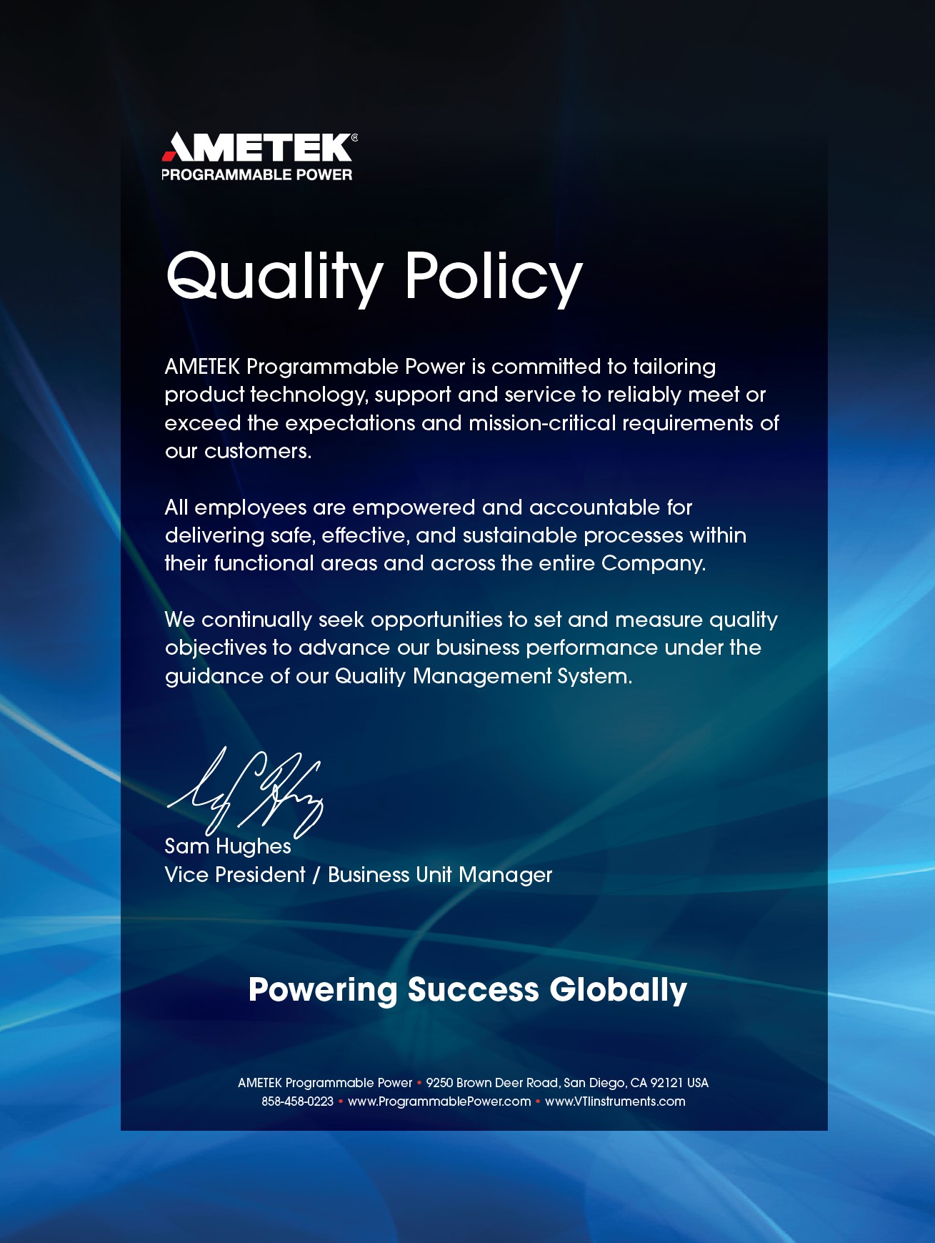 阿美特克程控电源事业部致力于为用户提供个性化的产品技术、支持和服务,以满足或超越他们的期望和关键任务要求。 所有员工都有责任在其职能范围和整个公司内提供安全、有效和可持续的流程。 我们不断寻求机会,制定和衡量质量目标,在质量管理体系的指导下推进业务绩效。